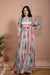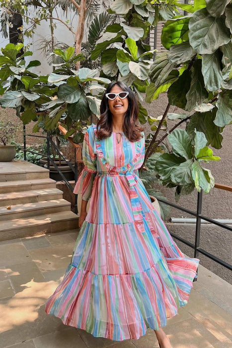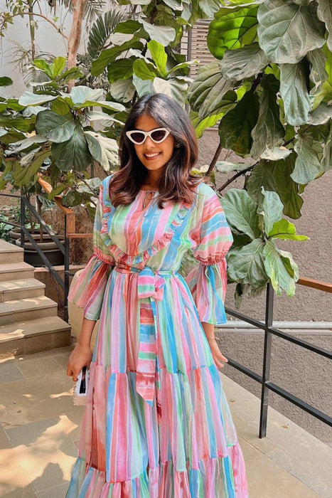 Loose-fit tiered dress with back and neck ruffled detailing, designed in our vibrant multi-colored print. Handcrafted in India using recycled chiffon fabric for a sustainable and stylish look.