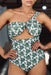 A blend of tradition and bold design, this swimsuit features a striking one-shoulder silhouette with a statement cutout, creating a flattering yet unique look. The rich green floral print, inspired by Jaipur's age-old block printing techniques, adds depth and character to the crisp white base. A high-leg cut enhances the silhouette, while the soft, stretchable fabric ensures all-day comfort.