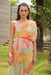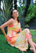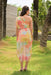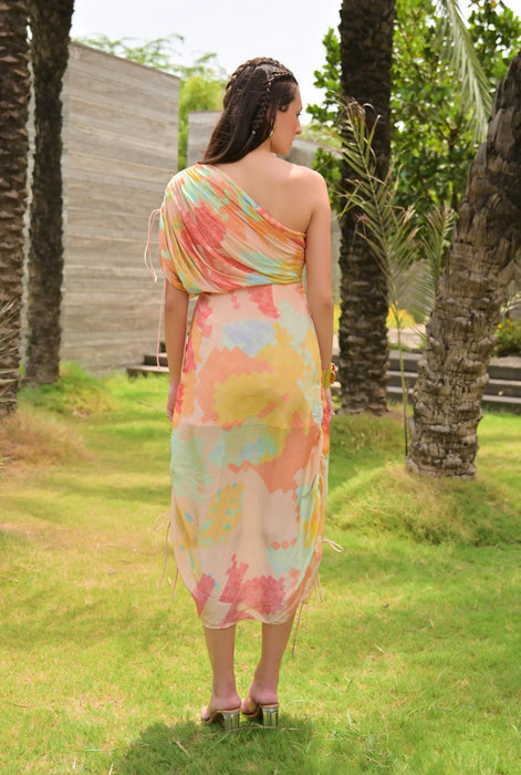 A unique one-shoulder design with adjustable gathers and a tie-up detail. The dress is equipped with a side zipper for easy wear and a lining that extends to the knees for added comfort. Additionally, cords are provided on both sides of the dress to allow for custom adjustments to the length. The dress has a straight silhouette.